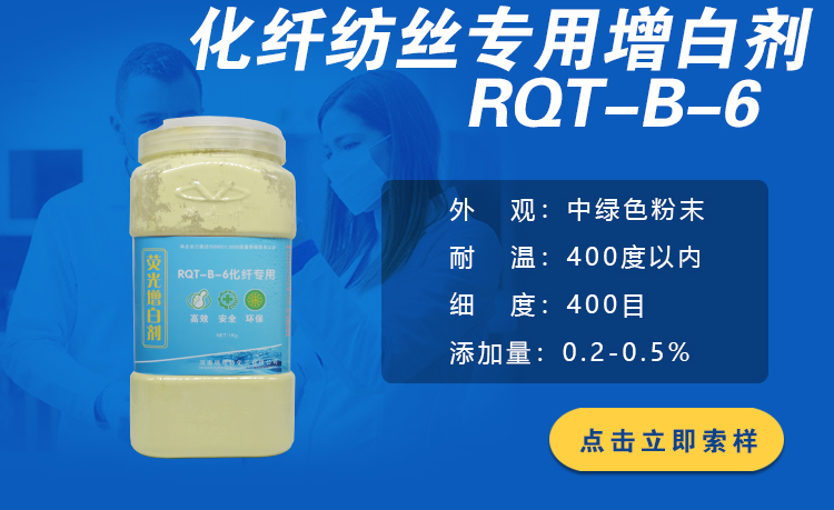 RQT-B-6荧光增白剂是一款我公司研发的新型专业型号增白剂,它的外观为中绿色粉末,具有耐候等级极高,耐热、耐晒、防褪色,增白、增亮、增艳性能显著!增白强度高,有强烈荧光,通过化纤拉丝高温与原料相容性好,并且拉丝顺畅,不会出现断丝的情况。