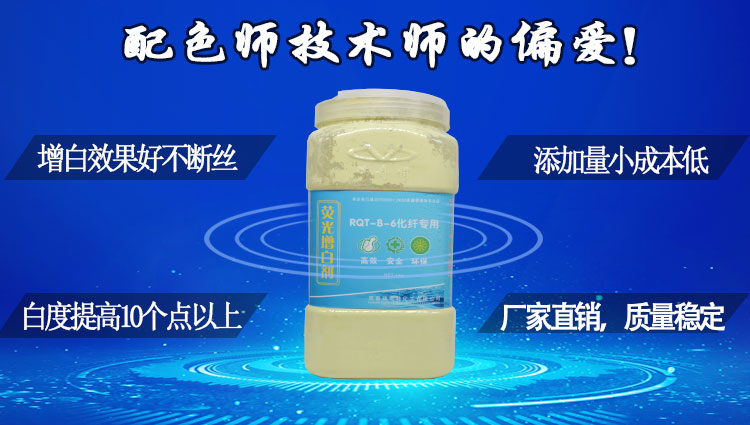 TQT-B-6荧光增白剂专用于再生纤维,合成纤维,长丝,短纤维,异性纤维,复合纤维,变形丝,普通纤维,特种纤维等 各种化纤产品增白,使用本产品能够大大提升纤维丝的白度、亮度与鲜艳度,使您的产品白的更白、彩的更艳、亮度倍增! 瑞奇特公司在塑料化纤行业,已经成功解决90%以上增白增亮问题。