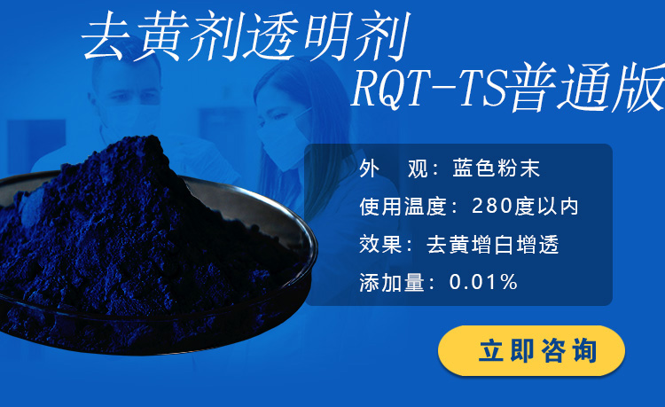 瑞奇特物料专用去黄剂RQT-TS-1专用于消除塑料制品加工时所产生的黄光,达到产品颜色鲜艳的目的。(本产品用于各类PVC塑料产品的消黄脱色,效果最佳),去黄,防黄且具有让人舒服的蓝光存在,可替代群青的压黄效果。